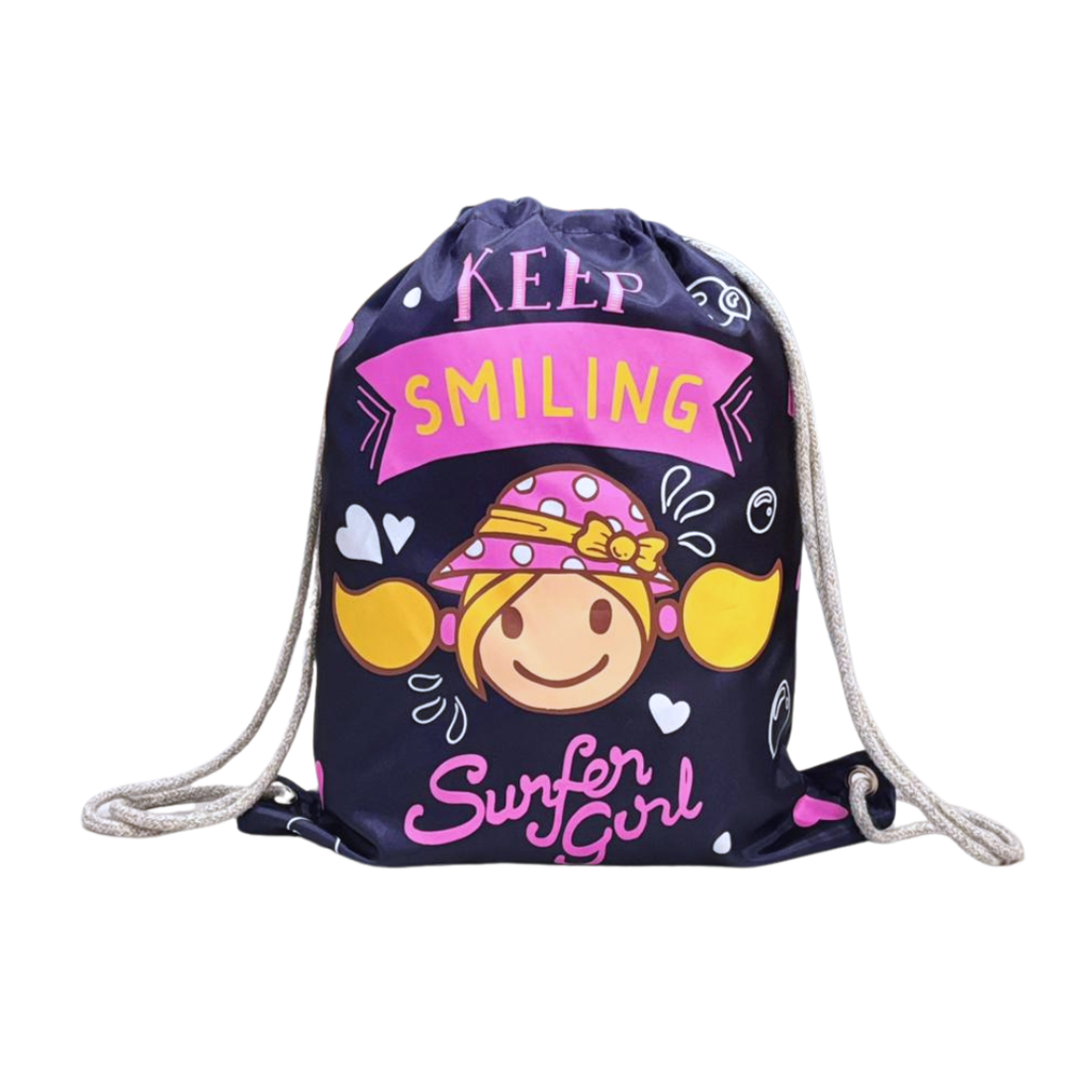Bring your happy vibes everywhere with the Surfer Girl “Smiling” Drawstring Bag in classic navy. The playful Surfer Girl character and fun “Smiling” design make it perfect for active and cheerful girls.